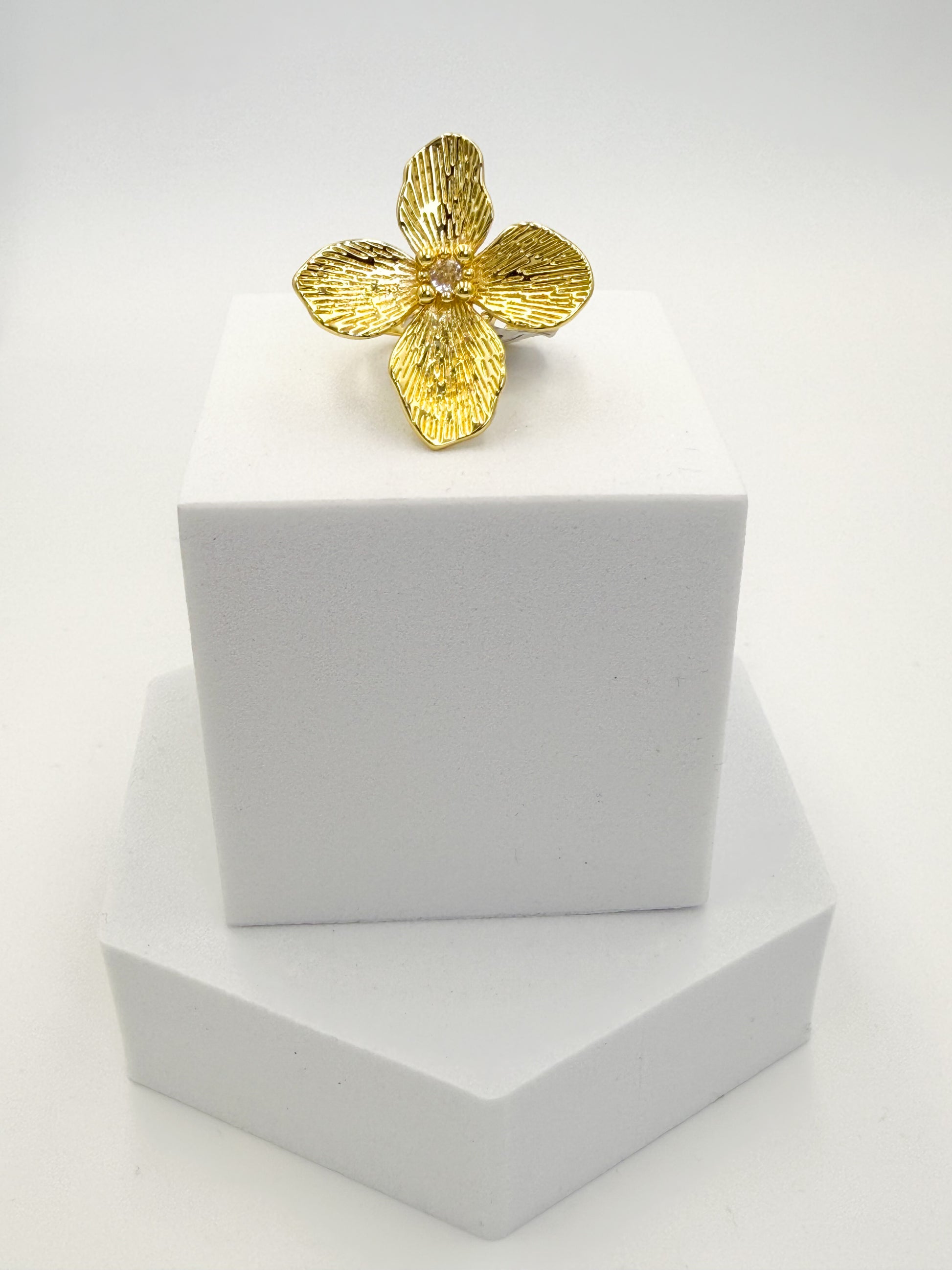 Anillo con piedreria, baño en oro 24k, ajustable, circon precioso, diseño en forma de flor.