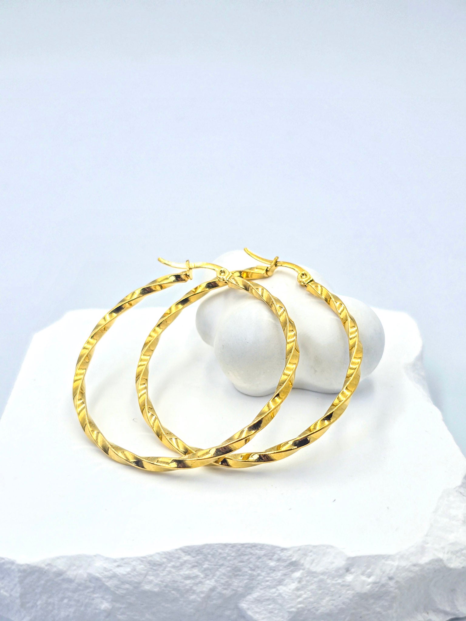 Arete Candonga, Baño en Oro 24k,diseño retorcido o trenzado, su acabado es pulido y elegante que refleja la luz y genera un efecto brillante muy atractivo.