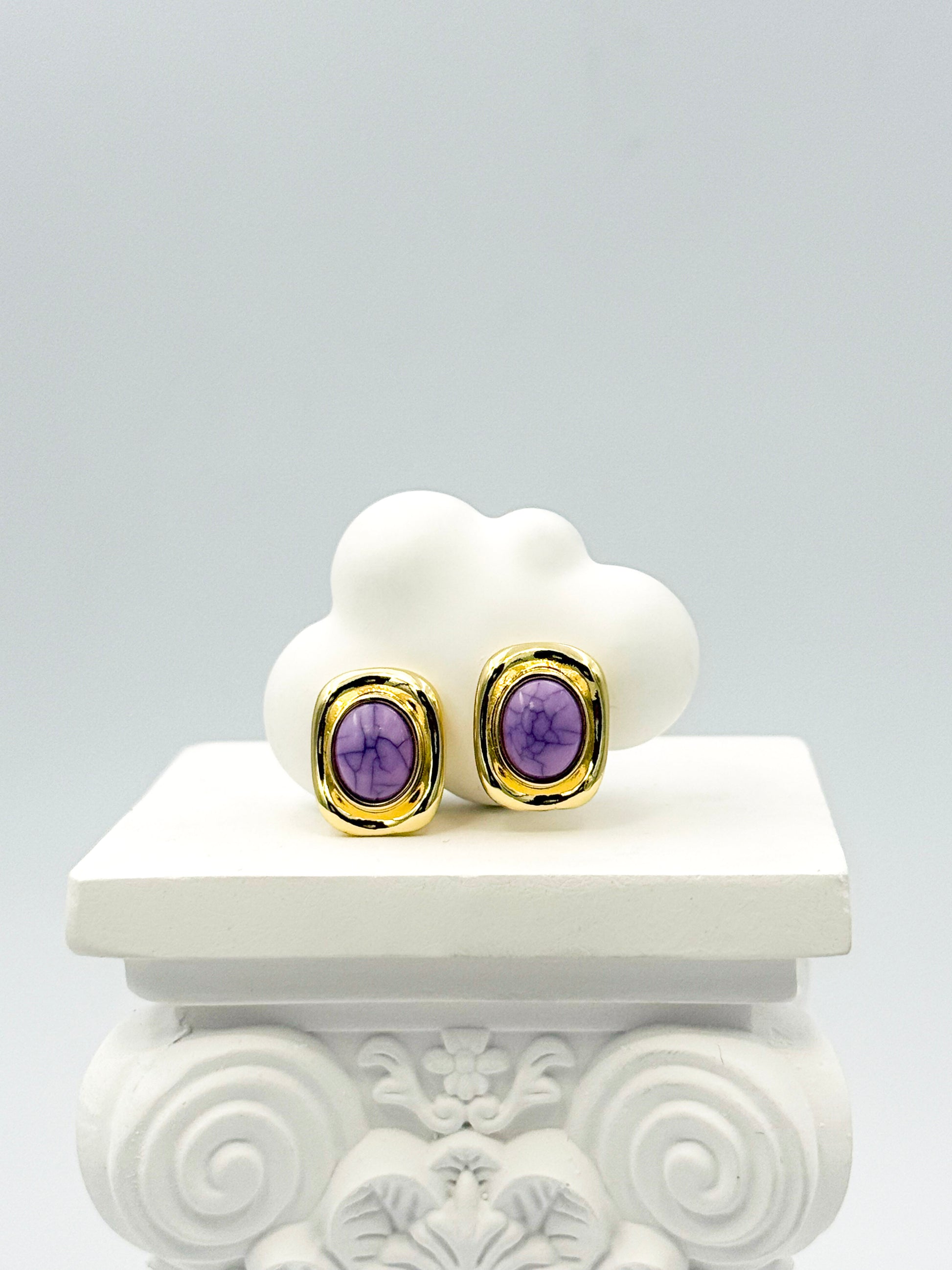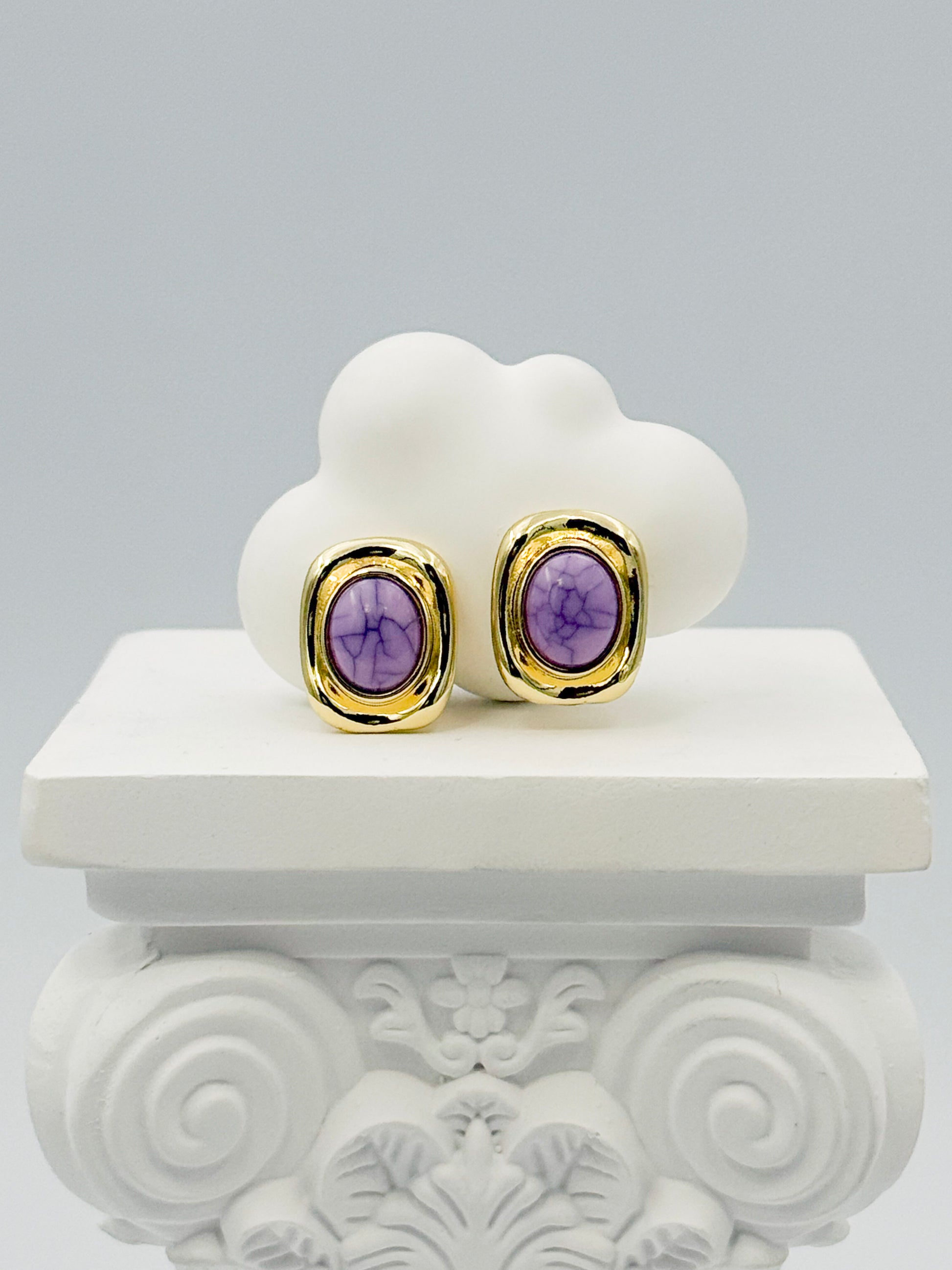 Los aretes presentan una estructura dorada de forma ovalada con acabado brillante. En el centro destaca una piedra decorativa en tono morado con delicadas vetas visibles, que aportan textura y un toque elegante al diseño.