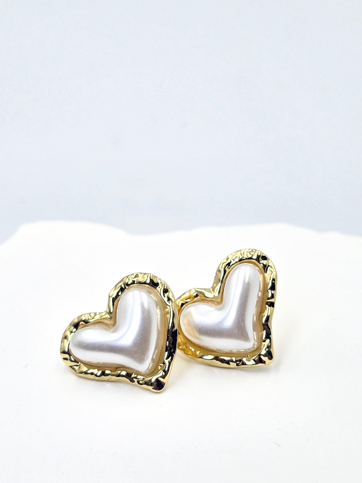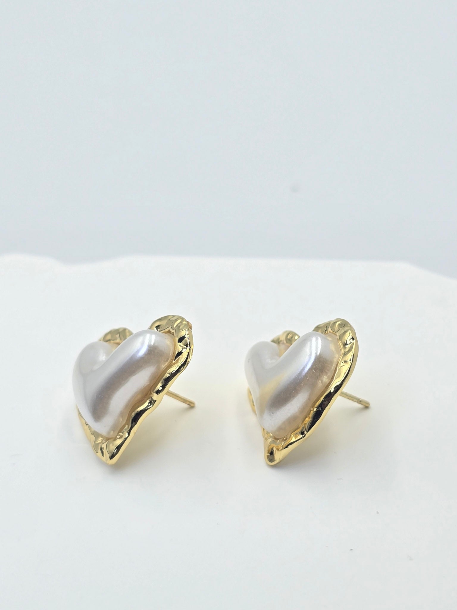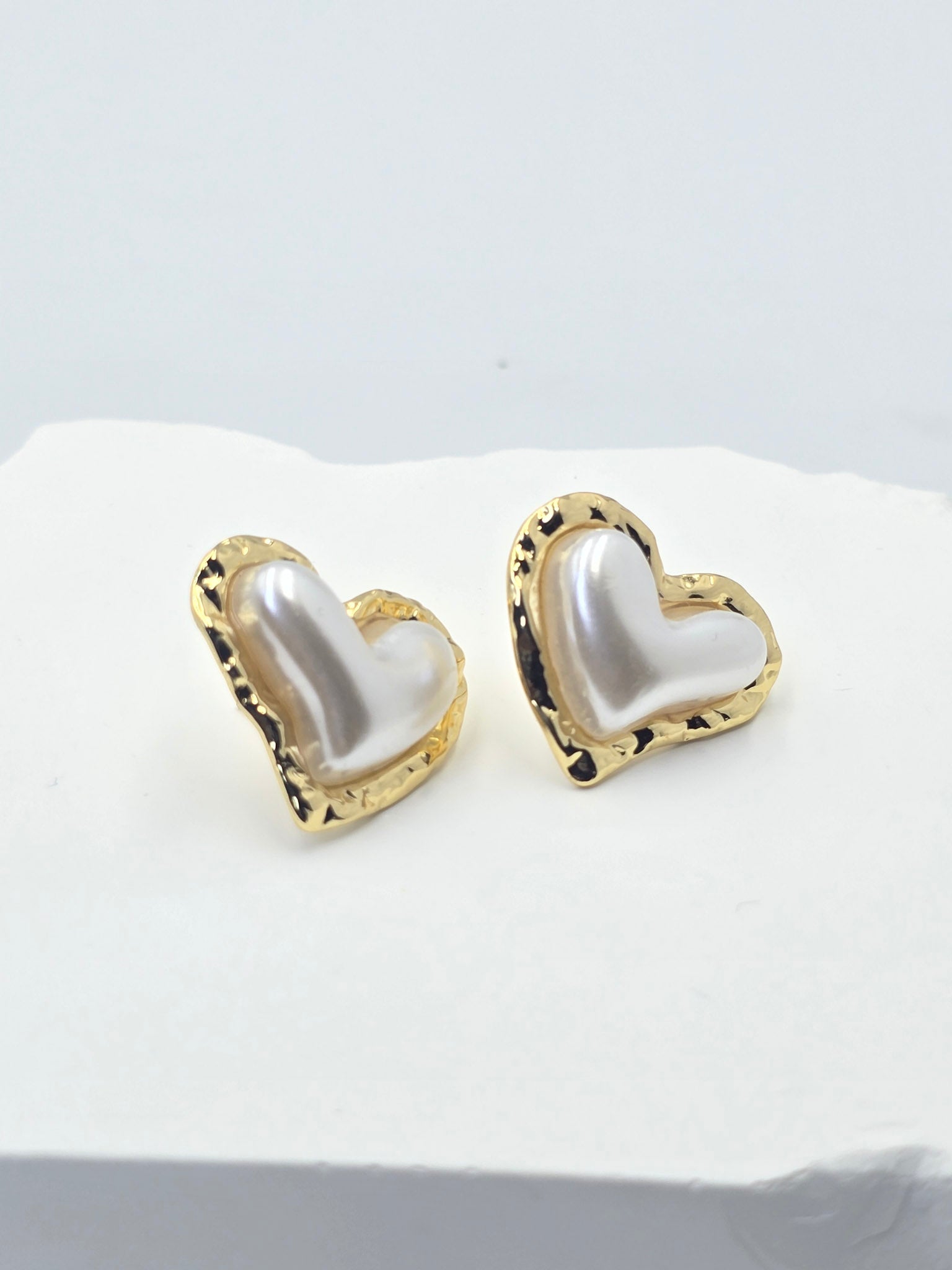 Arete Topo, Baño en Oro 24k,diseño romántico en forma de corazón. Los aretes presentan un centro perlado con acabado nacarado que refleja suavemente la luz, rodeado por un borde dorado de textura irregular que añade un toque artesanal y elegante.