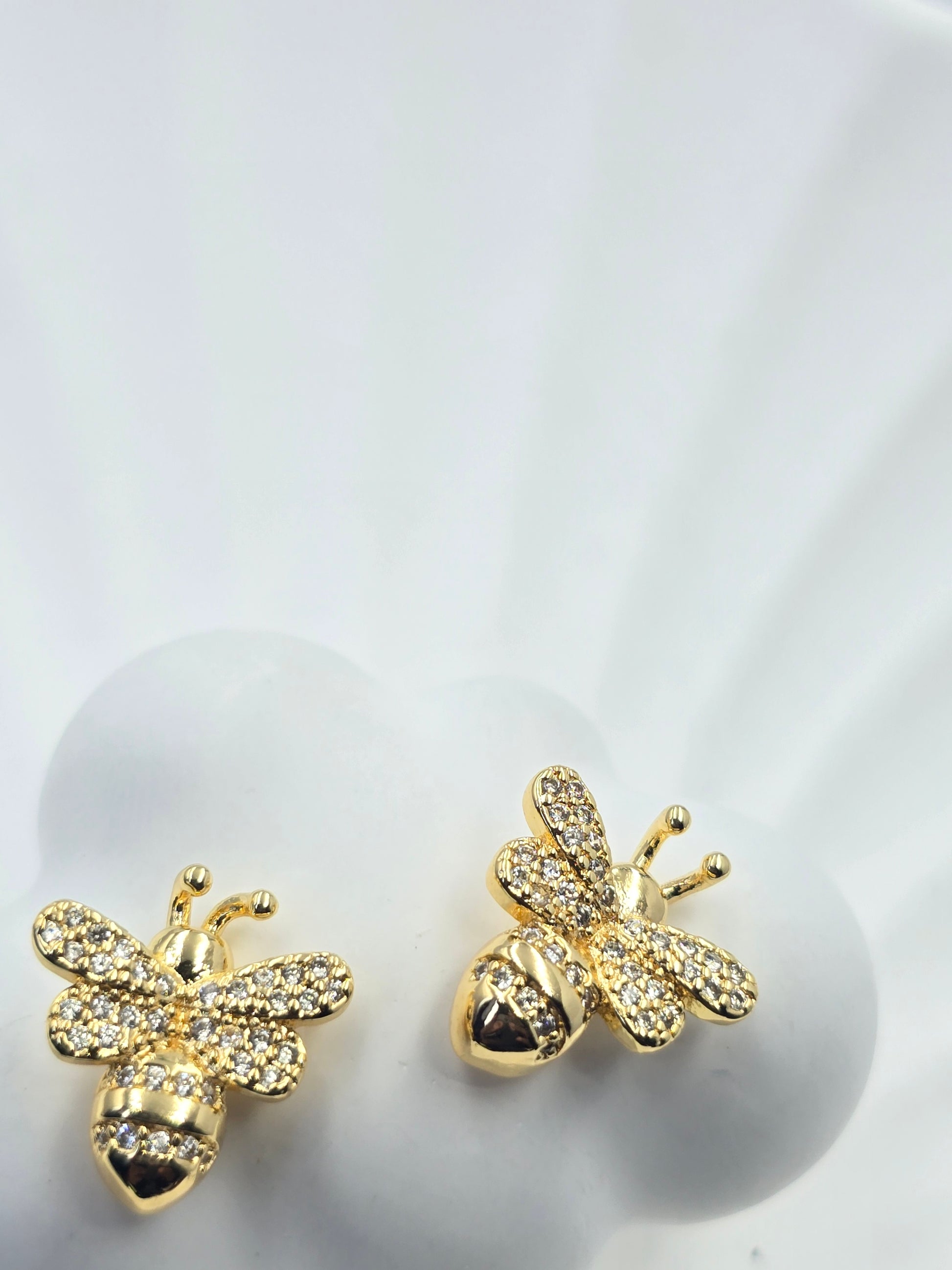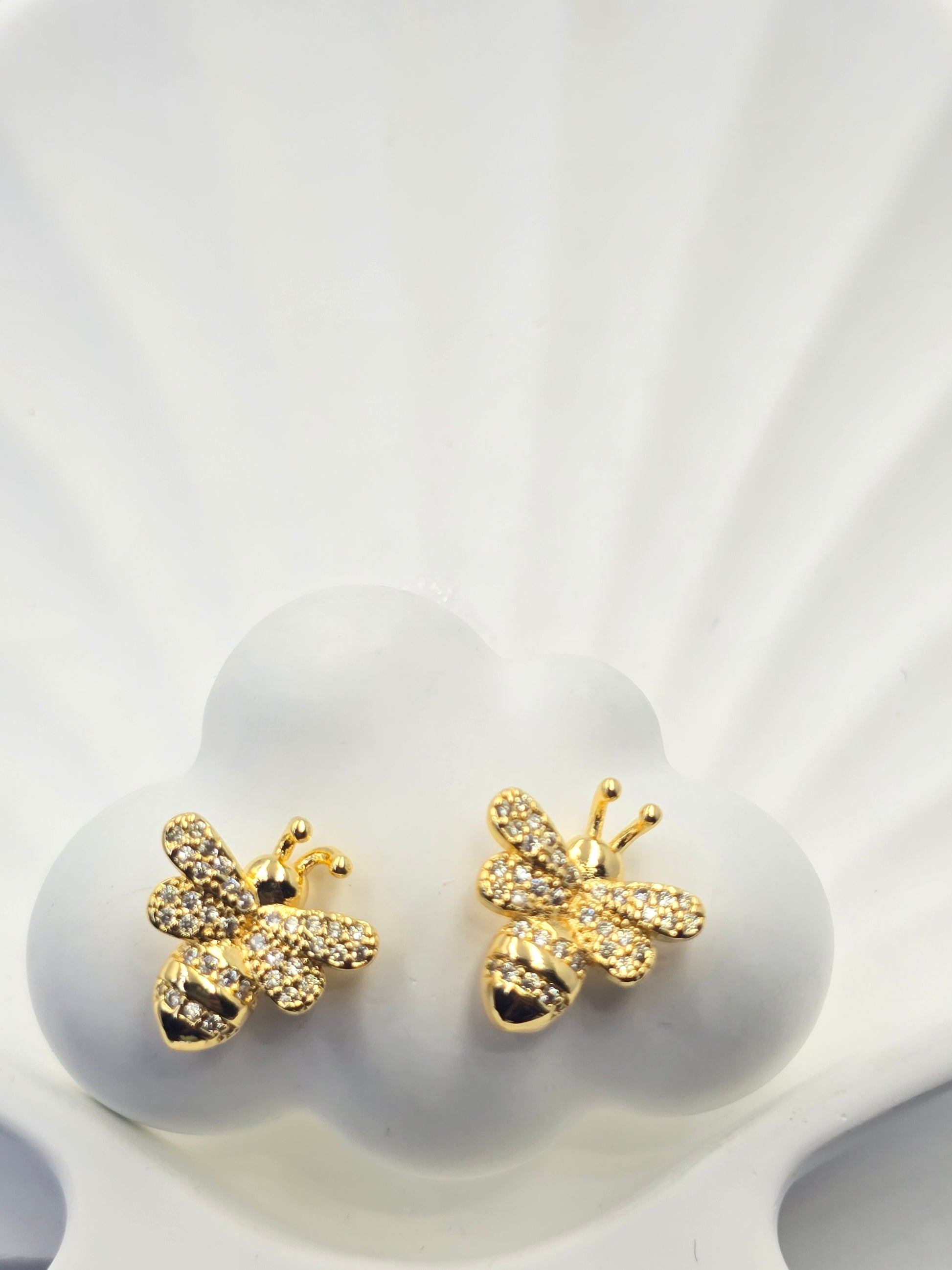 Arete Topo, Baño en Oro 24k, diseño, con corma forma de abeja en un tono dorado brillante y cubierto de circones que aportan un efecto de brillo y elegancia.