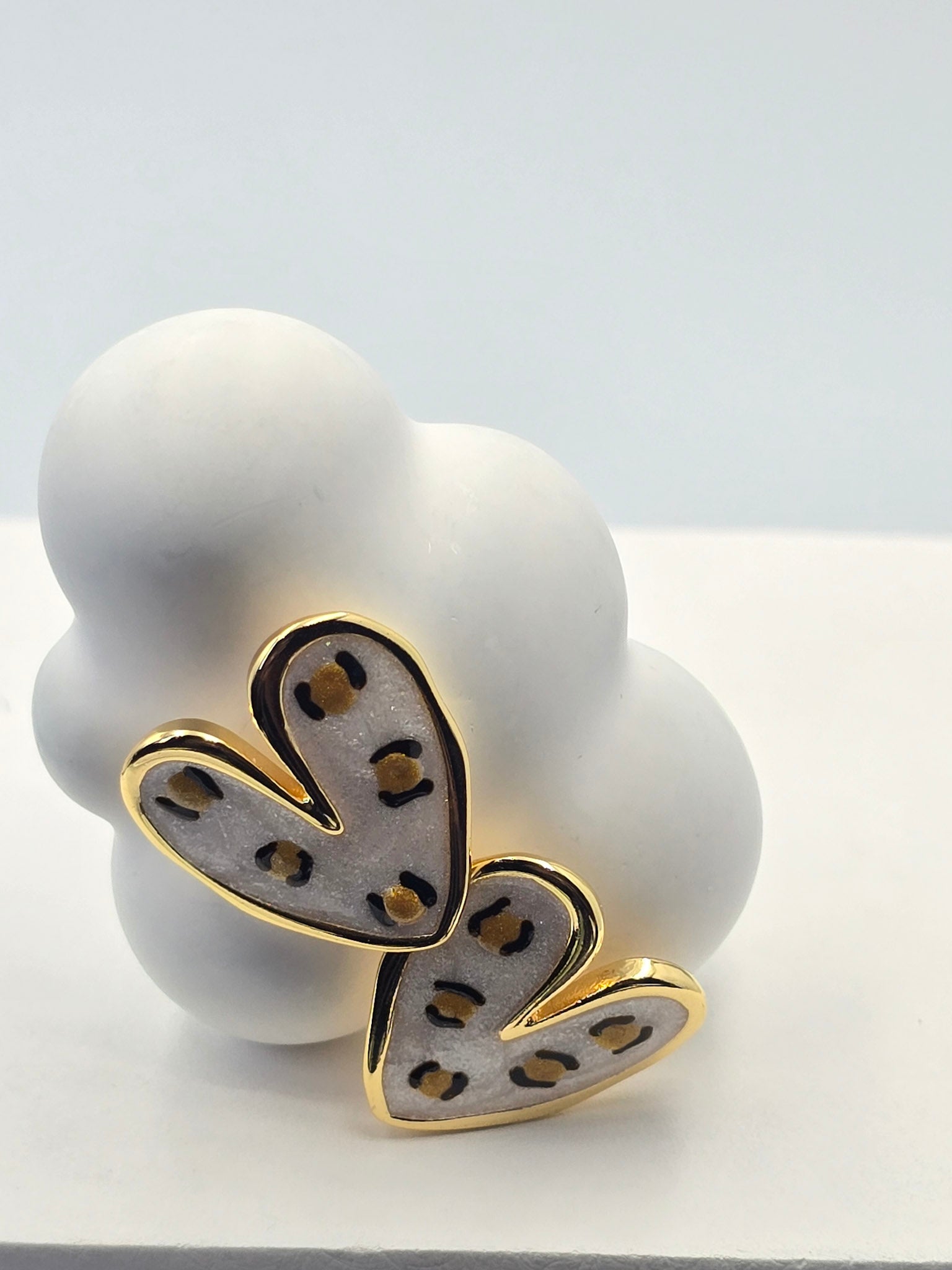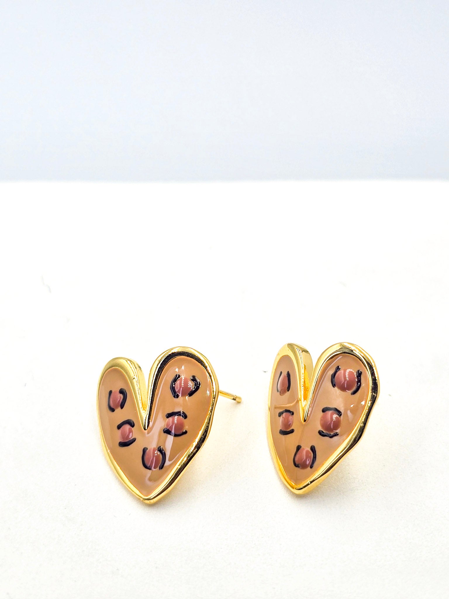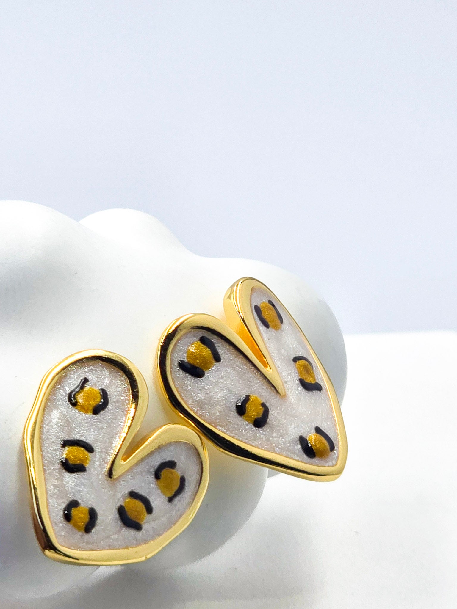 Arete Topo, Baño en Oro 24k, diseño moderno y artístico, con el contorno en metal dorado brillante y el interior decorado con un fondo nacarado perlado de tono claro y oscuro.